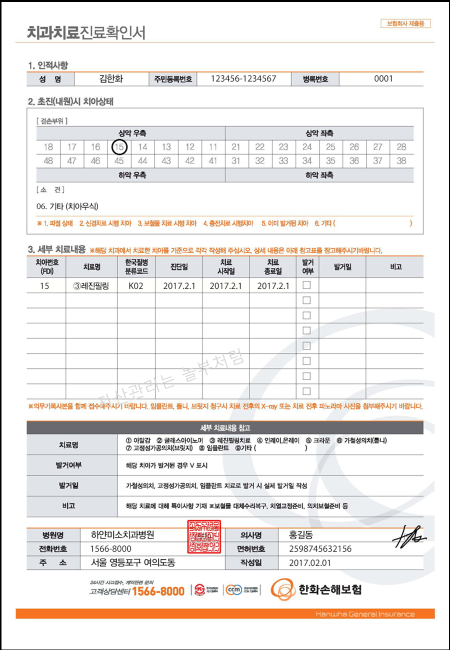 | ※ 치과치료 확인서 필수 포함 내용 - 치료한 영구치의 위치 또는 치아번호 - 해당 영구치의 내원 당시 치아상태 - 직접적인 치아치료원인 - 진단확정일, 진료시작일, 진료종료일, 진료일수 |
