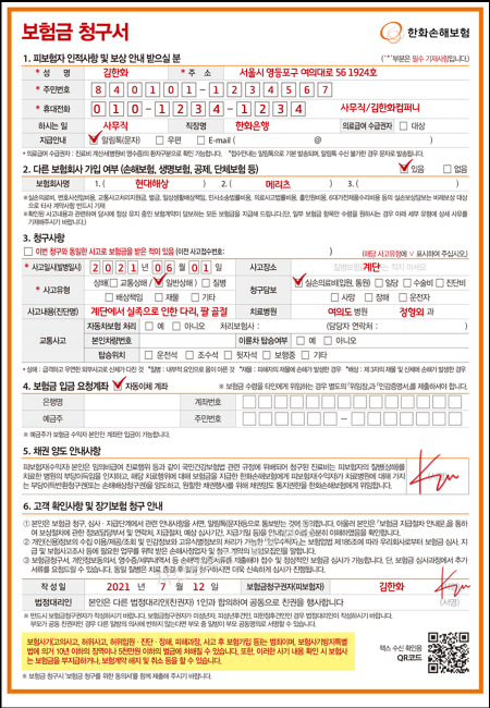 <보험금 청구서 샘플>